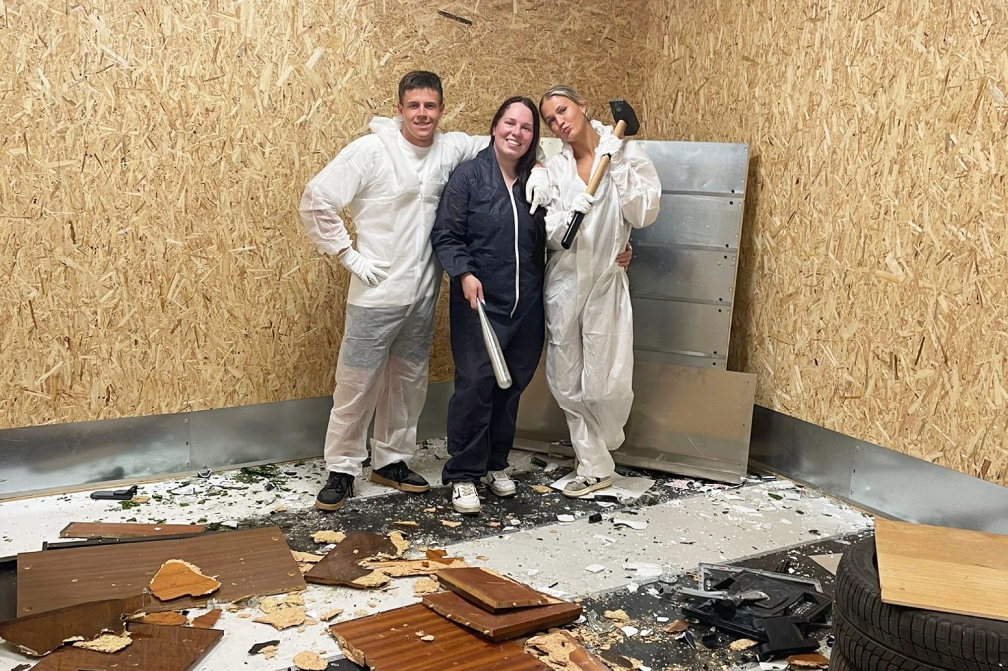Nāc viens vai ņem līdzi draugus – šī sesija ir paredzēta kompānijai līdz pat četrām personām. Hammer & Scream parūpēsies par pilnu drošības ekipējumu, iedodot ikvienam dalībniekam vienreizējo aizsargtērpu, cimdus, ķiveri un brilles, kā arī vienu izvēlēto ieroci – smagu āmuru vai beisbola nūju. Tavs uzdevums ir pavisam vienkāršs un atbrīvojošs: pārvērst šķembās 30 traukus un divus galdus, ko dusmu izlādes istabas komanda ir sagatavojusi bezierunu iznīcīnāšanai.